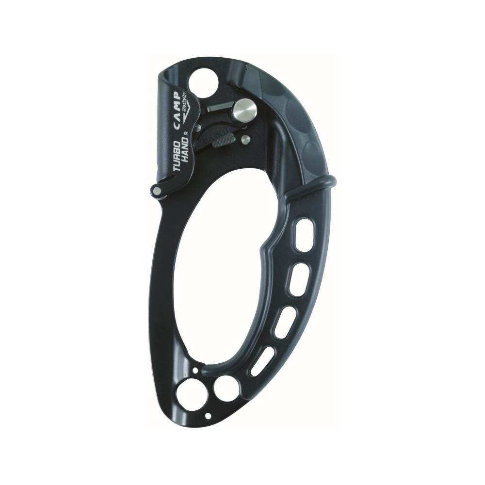 удобного расположения педали и уса. Отверстия для самоочистки находятся как на корпусе зажима, так и на самом кулачке, что уменьшает налипание песка и грязи. Внизу рукоятки имеются отверстия для крепления направляющего упора GUIDE - приобретается отдельно или идет в комплекте в версии TURBOHAND PRO. Патентованный ролик также позволяет использовать Turbohand в качестве блок-ролика с зажимом при нагрузках до 50 кг. ВАЖНО: Такое использование не предназначено для подъема или спасения людей. Диаметр веревки: 8-13 мм Вес: 198 гр Сертификаты: EN 12841/B, EN 567, ТР ТС 019/2011